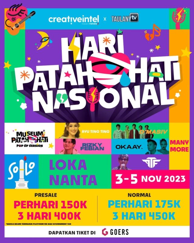 Hari Patah Hati Nasional Solo – Kabar baik untuk warga Solo dan sekitarnya! Konser Hari Patah Hati Nasional akan menyambangi Kota Solo pada awal November mendatang. Event yang diadakan oleh Creativeintel x Taulany TV akan menghadirkan banyak bintang tamu spesial. Tidak hanya konser musik saja, pada festival ini juga akan ada acara main bareng, Bazar UMKM lokal Kota Solo, dan juga akan ada Tenant dari Lokananta.