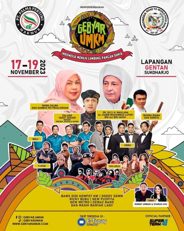 Gebyar UMKM Gentan Sukoharjo – Acara “Gebyar UMKM 2023” merupakan sebuah acara yang bertujuan untuk mendukung dan mempromosikan Usaha Mikro, Kecil, dan Menengah (UMKM). Dalam rangkaian acara gebyar UMKMM yang diselenggarakan di Lapangan Gentan ini akan ada banyak acara yang menarik untuk dilewatkan. Akan ada Pameran Produk sebanyak 2000 booth peserta, Baza atau Pasar Kreatif, Pelatihan dan Workshop, Talk Show, Live Cooking, Business Coaching dan Konser Musik sebagai puncak acara.