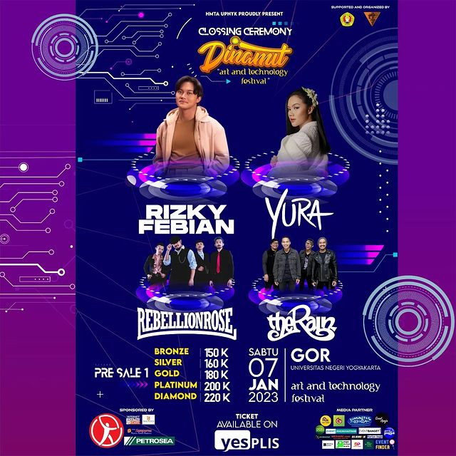 Rizky Febian & Yura Yunita on Dinamit Jogja 2023 | Masih bingung untuk mengisi acara liburan awal tahun 2023? Dinamit (Dinamika Anak Tambang) UPN Jogja, bakal ngajak kamu untuk ngumpul bareng dalam Clossing Ceremony Dinamit. Acara yang bertajuk “Art and Technoloy Festival” ini menghadirkan bintang Tamu Rizky Febian dan Yura Yunita. Tidak hanya itu saja, Konser Musik Dinamit Jogja juga menampilkan Rebellion Rose dan The Rain. Acara ini digelar pada hari Sabtu tanggal 07 Januari 2023 bertempat di GOR UNY Jogja. Tiket acara ini dibagi dalam beberapa kategori dengan harga Presale sebagai berikut :